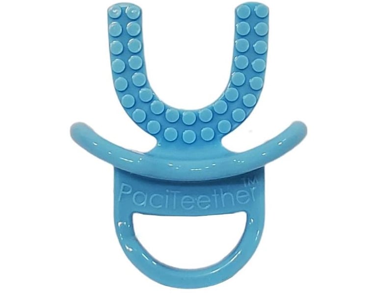 PaciTeether™ is a patented product that provides the functions of both a pacifier and a teether in one. We designed it to be hands free and recommend it for ages 6 months-5 years. PaciTeether™ is able to handle all teething stages because it targets all teeth and it can even be used for teeth grinding prevention. It is chill safe, non-toxic and made in 100% USA food grade silicone. PaciTeether™ is the only product on the market today with a shield plate that is manufactured in one piece. No assembling parts minimize choking hazards, making it the safer choice for your little one. Recommended by dentists, autism specialists, etc, it's easy to see how we're “Pioneering a teething revolution!"